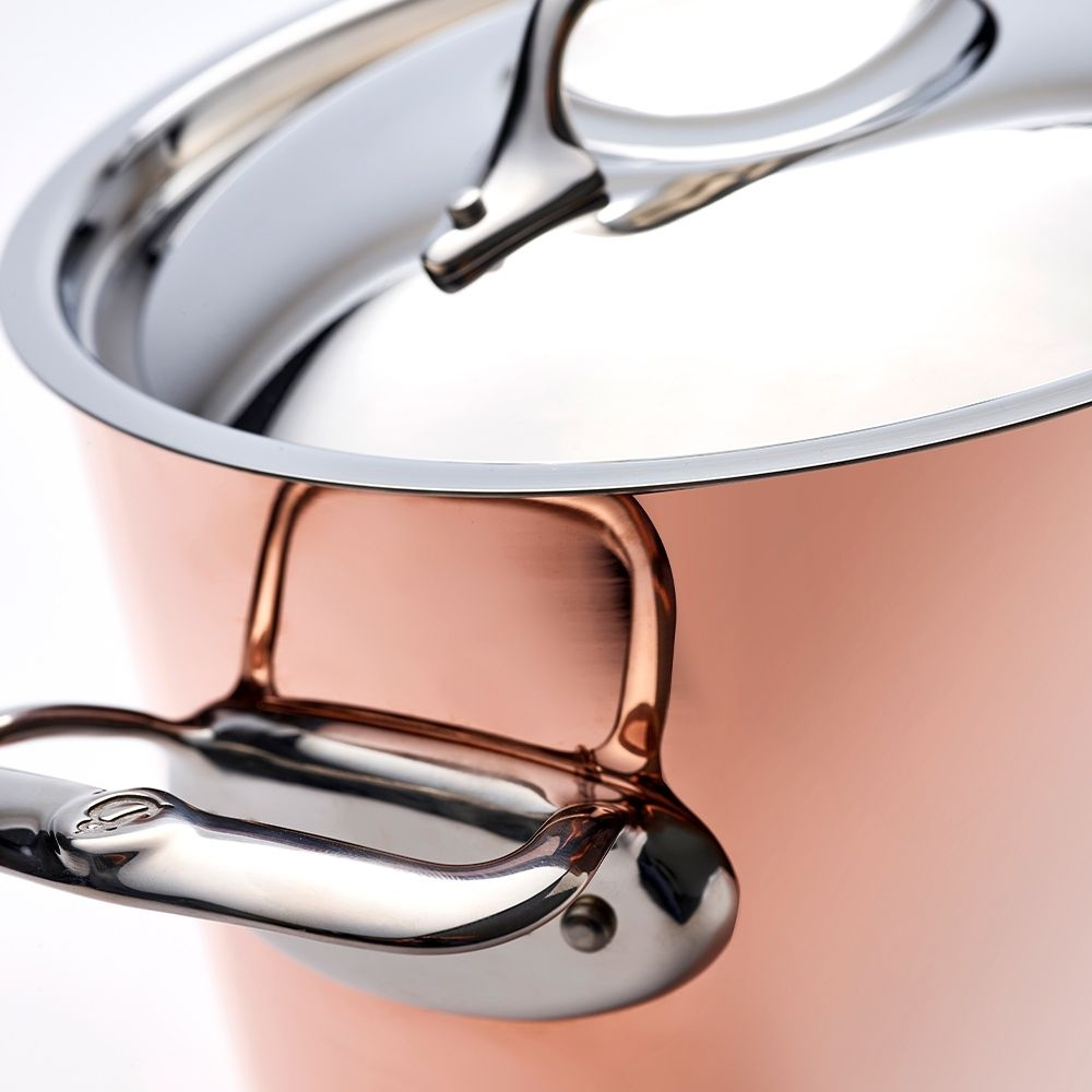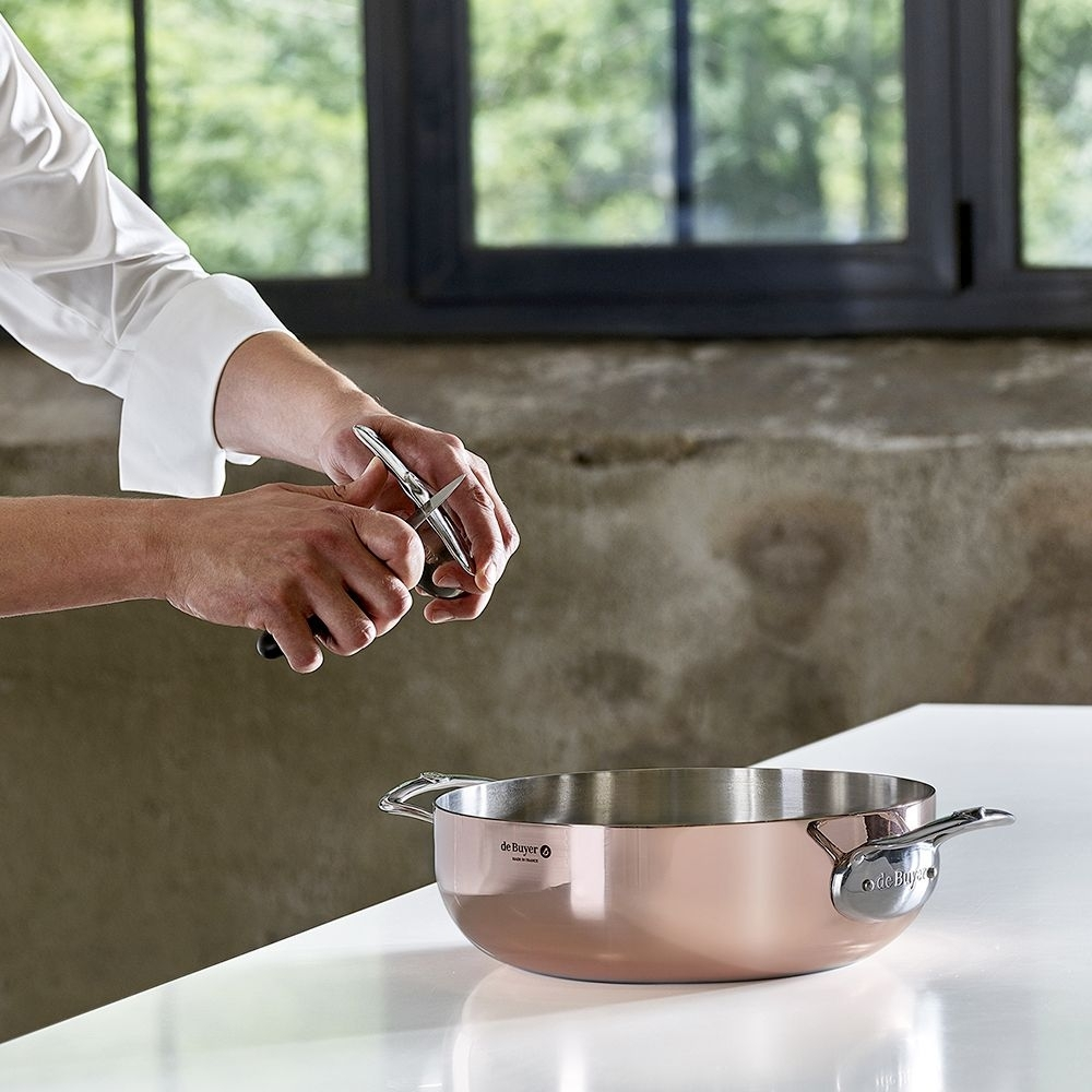 de Buyer Inocuivre – Nicht induktionsgeeignet. Für alle anderen Herdarten geeignet. Kupfer ist der beste Hitzeleiter, um beim Kochen den vollen Geschmack zu erhalten. Dieses Material verteilt die Hitze schnell und gleichmäßig: Nicht nur auf dem Boden, sondern auch auf den Wänden; ein Heizkreislauf entsteht, und die Zutaten werden gleichmäßig gekocht. Ideal für empfindliche Gerichte, für Saucen und allgemein zum Einkochen von Flüssigkeiten.