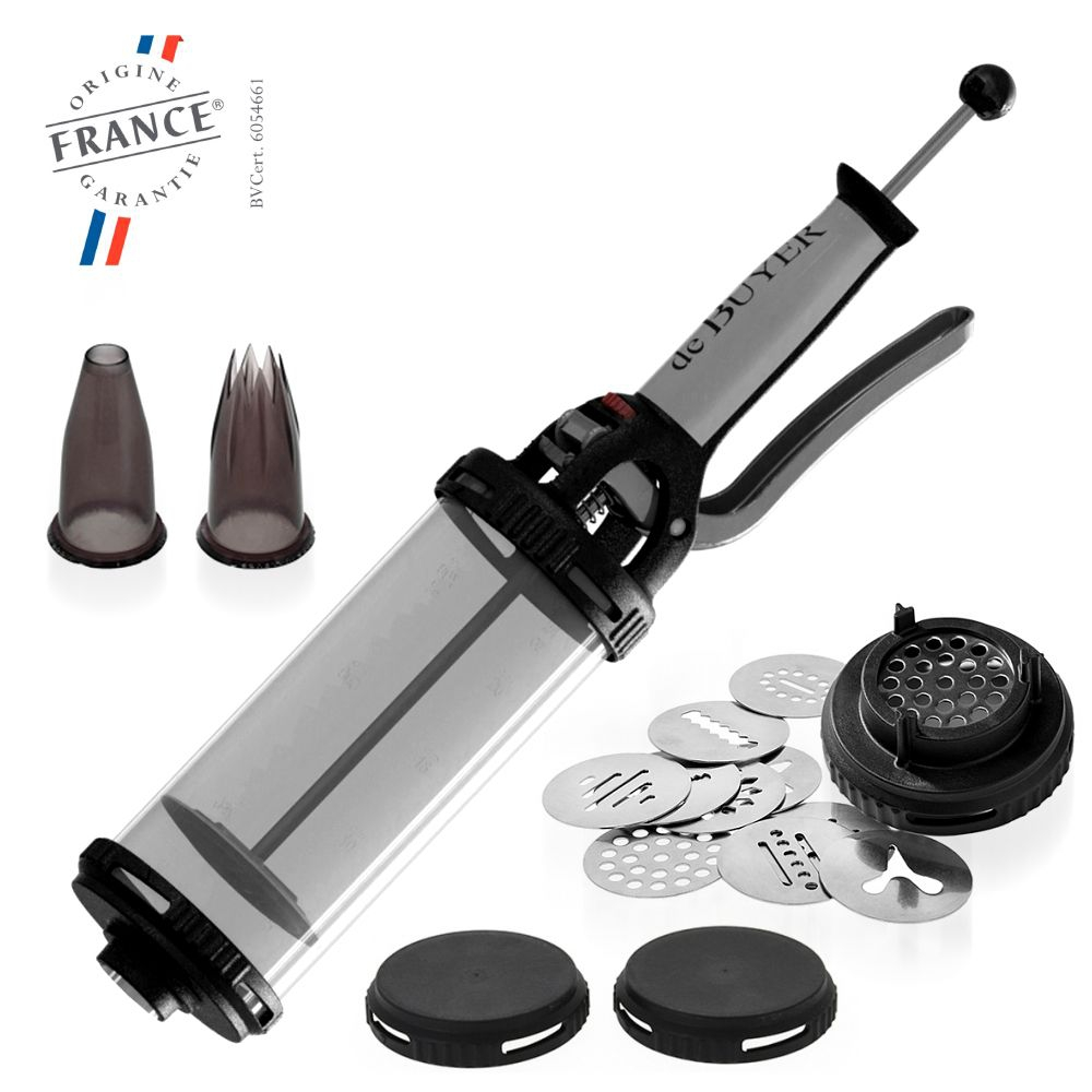 de Buyer – Le Tube – Küchenspritze inkl. Kekse Kit – Mit dem perforiertem Deckel und 13 Dekorscheiben aus Edelstahl – Zum einfachen Dosieren von Teig-, Creme- und Schaumzubereitungen. Zum Garnieren, Füllen und Verzieren. Für einfaches, schnelles, präzises und sorgfältiges Arbeiten. Lässt sich bequemer füllen als der Spritzbeutel. Mit Rädchen für einfache Druckeinstellung zum Erhalt der gewünschten Dosiermenge (1 bis 5 cl). Abnehmbare und austauschbare Tülle.