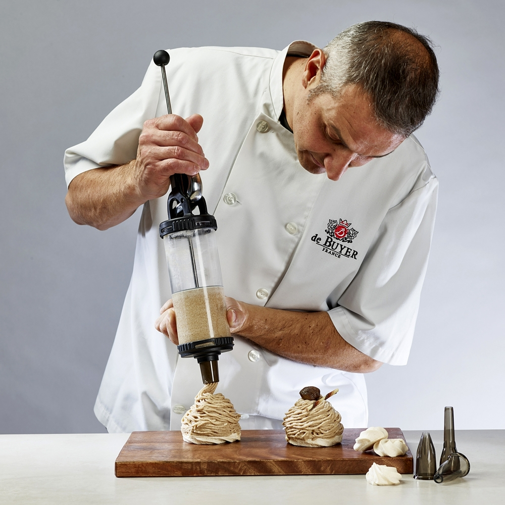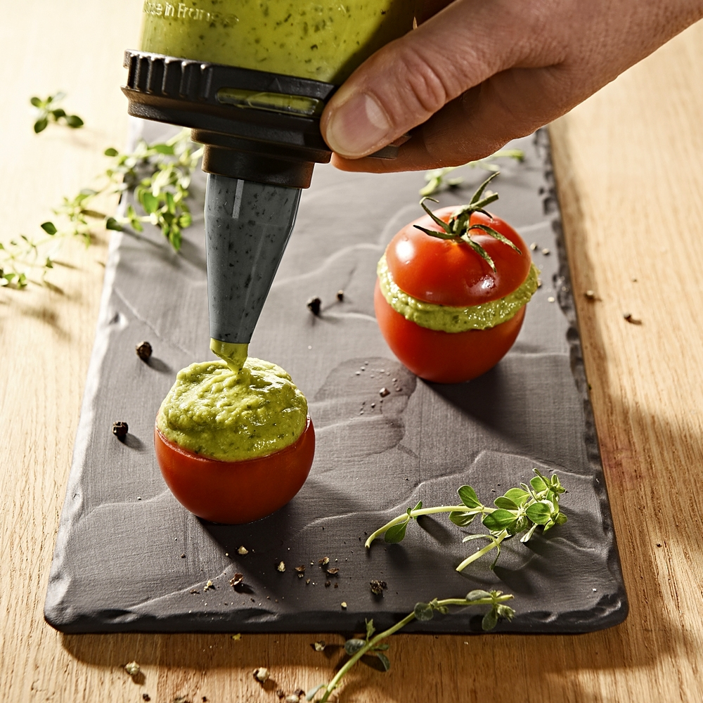 - Abnehmbare austauschbare Tülle. Geeignet für alle Kunststofftüllen des Angebots von de Buyer, egal ob glatt oder geriffelt oder sonstige Modelle