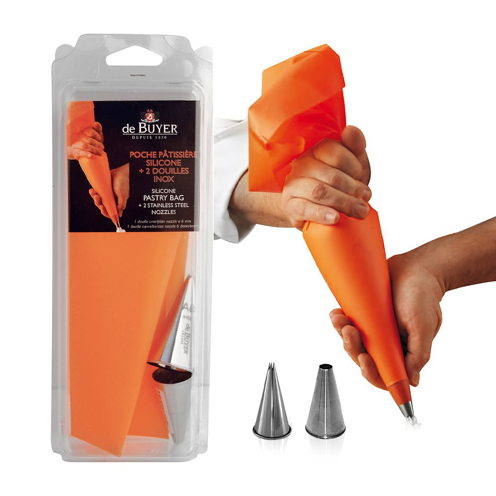 In diesem Set finden Sie einen weichen PUR-Beutel (35 cm lang) und 2 Tüllen aus rostfreiem Stahl (eine einfache Düse zum Garnieren und Füllen, eine geriffelte Düse mit 6 Zähnen zum Dekorieren mit Sahne, Gebäck usw.). Der Spritzbeutel hat eine glatte innere Oberfläche, die es den Präparaten erleichtert, in Richtung der Düse zu gleiten und eine gute Reißfestigkeit bietet. Die Düsen können einfach von innen in den Taschenboden eingesetzt werden. Sie sind aus Edelstahl gefertigt, langlebig und sorgfältig verarbeitet. Die Zähne an den geriffelten Düsen sind regelmäßig und symmetrisch. Alle Teile sind spülmaschinenfest.