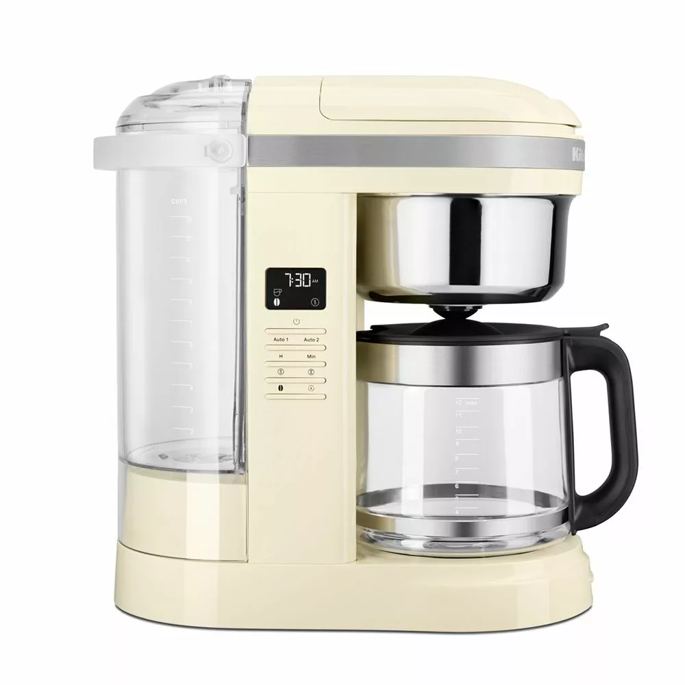 Mit der Drip-Kaffeemaschine für 12 Tassen von KitchenAid können Sie jederzeit köstlichen Kaffee zubereiten. Diese Kaffeemaschine wurde konzipiert, damit Sie Ihren Kaffee mit dem von Ihnen bevorzugten Geschmack und Aroma perfektionieren können – so wird die Zubereitung einer guten Tasse Kaffee zum Kinderspiel. Der einzigartige spiralförmige Wasserauslass mit 29 Löchern sorgt dafür, dass das Kaffeepulver gleichmäßig aufgegossen wird, und verleiht der Tasse Kaffee durch die optimale Extraktion gleichzeitig ein vollmundiges Aroma. Mit der Brühstärken-Taste können Sie zwischen regulären und kräftigen Kaffeestärken wählen und erhalten so eine Tasse schmackhaften Kaffee ganz nach Ihren Wünschen. Dank der Dosierungsanzeigen auf dem wiederverwendbaren goldfarbenen Filter und dem Wassertank hat das Rätselraten beim Zubereiten von Kaffee endlich ein Ende. So wird jede Tasse zum perfekten Genuss. Der einzigartige Auslauf der Glaskanne verhindert das Tropfen und Verschütten von Kaffee und sorgt so für ein müheloses Ausgießen in Tassen jeder Größe und Form. Mit dieser Drip-Kaffeemaschine können Sie Ihren Kaffee aufbrühen, wann immer Sie wollen – dank der zwei automatischen Programmiereinstellungen ist Ihr Kaffee zu jeder gewünschten Tageszeit fertig und wartet auf Sie. Die „Pausieren und Ausgießen“-Funktion ermöglicht es Ihnen, den Brühvorgang jederzeit zu unterbrechen und schon vor Abschluss des Vorgangs eine köstliche Tasse Kaffee zu genießen. Und mit der programmierbaren Warmhalteplatte behält Ihr Kaffee bis zu 40 Minuten lang die gewünschte Temperatur. Perfekt, wenn Sie morgens etwas mehr Zeit benötigen. Die moderne und elegante Drip-Kaffeemaschine von KitchenAid ist auf jeder Küchenarbeitsplatte ein echter Hingucker.