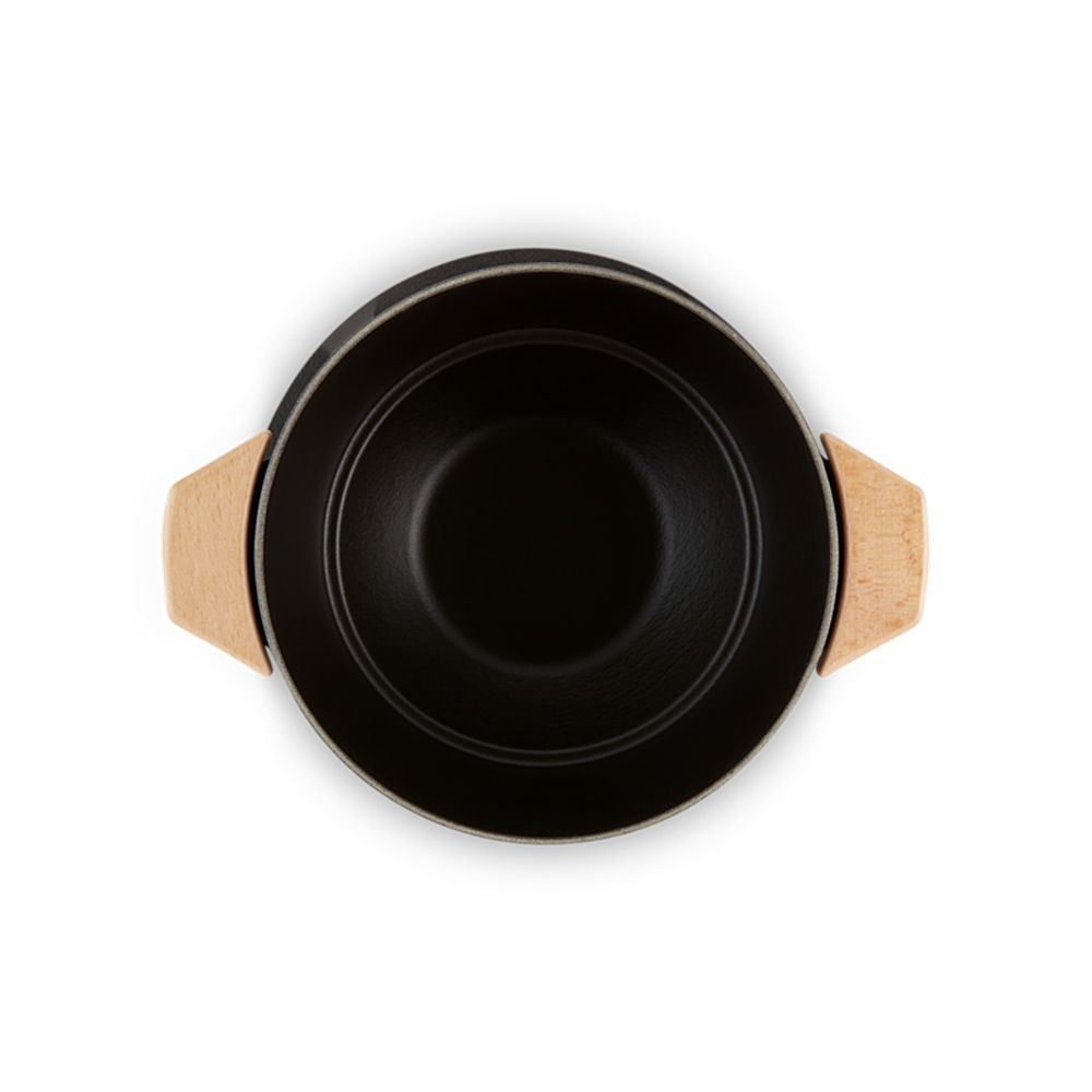 Die schwarze Emaillierung ist aus traditionellen Gründen etwas rauer gehalten. Die meisten denken, dass Gusseisen schwarz ist (wobei es grau ist) und durch die etwas rauere Emaillierung wird die Eigenschaft des Materials Gusseisen auf die Außenseite übertragen. So entsteht ein traditionelles Aussehen des Kochgeschirrs.