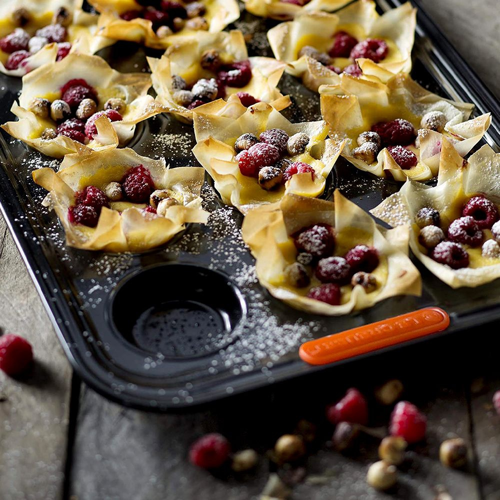 Backen Sie hausgemachte Cookies, Brötchen, Mini-Quiches und mehr im Handumdrehen mit dieser 12er-Tarteletteform von Le Creuset. Die Form verteilt die Hitze gleichmäßig und sorgt so für großartige Ergebnisse. Wenn Ihre Köstlichkeiten fertig sind, können Sie sie dank der Antihaftbeschichtung leicht herausnehmen. Bereiten Sie in Windeseile Köstlichkeiten für viele Personen zu.