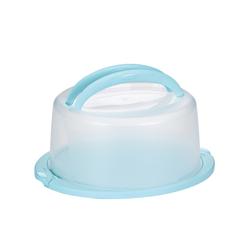 Tortencontainer Deli aus Kunststoff in Pastellblau. Maße der Kunststoffhaube: Ø 30 cm, der Gesamtdurchmesser ist daher etwas höher, Gesamthöhe (ohne Griffe) 17 cm.